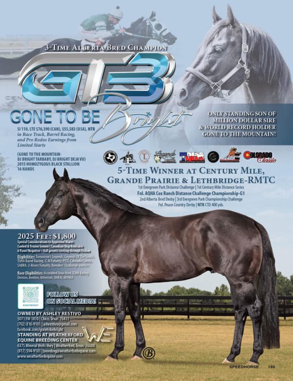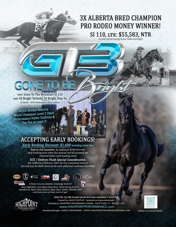 SI 110LTE: $55,583 in race, barrel racing and pro rodeo earnings3x Alberta Bred Champion5x Race winner at Century Mile, Grande Prairie and Lethbridge-RMTCPro Rodeo Money Winner2025 Level 2 Champion Performance Halter Stallion AQHA World Show2025 Open Performance Halter Stallion Top Ten AQHA World Show2024 Level 2 Bronze Performance Halter Stallion AQHA World Show ONLY standing son of Million Dollar Sire and World Record Holder GONE TO THE MOUNTAIN!
