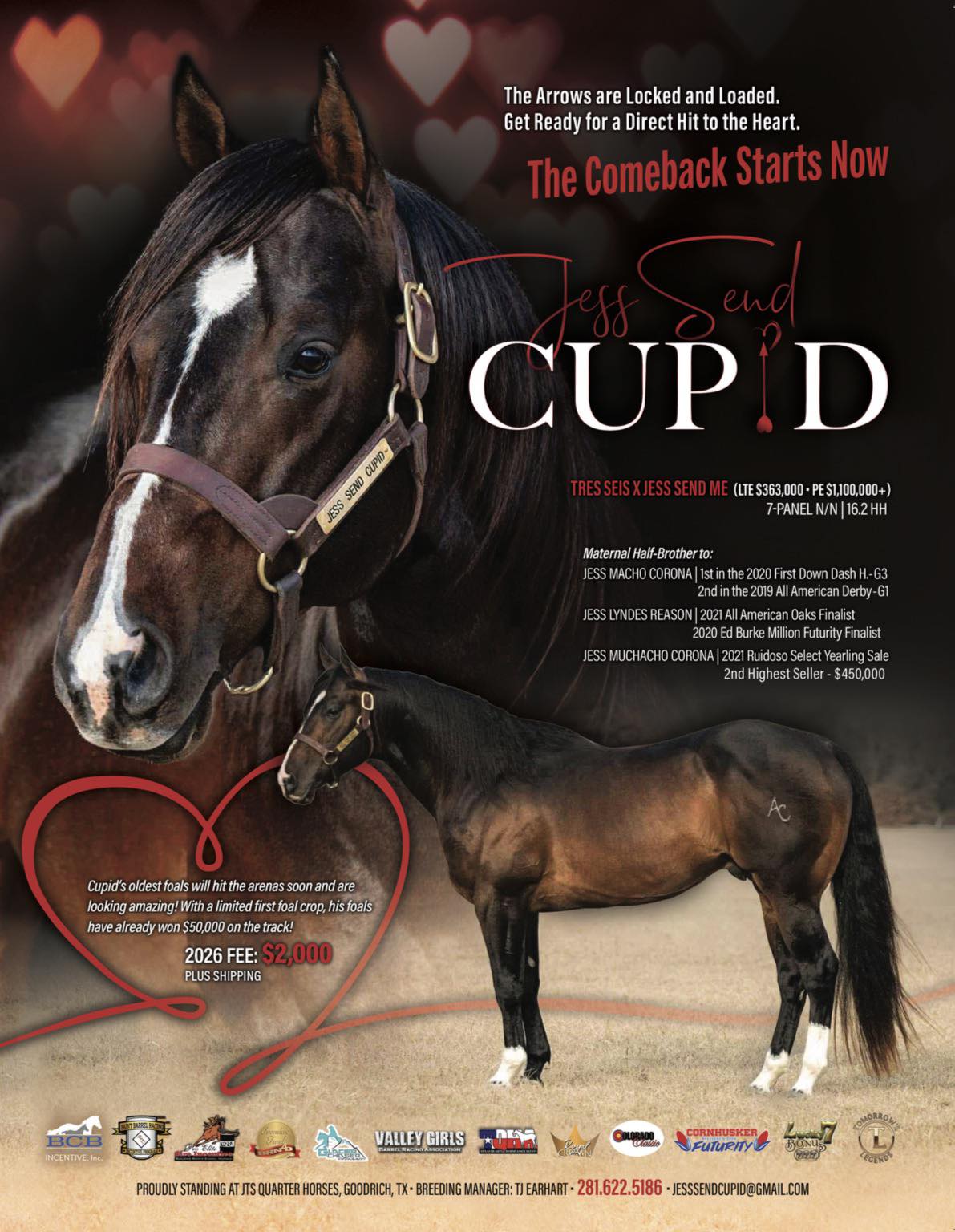 Jess Send Cupid: A Powerhouse of Proven Genetics A son of the legendary Tres Seis, stands an impressive 16.2 hands tall and weighs nearly 1,500 pounds. His strong bone structure and exceptional conformation make him an incredible cross for both barrel and racehorses.