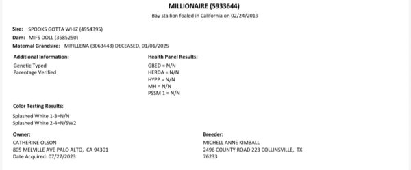This 2026 Stallion Breeding contract is transferable to the mare owner/buyer who purchases a 2026 breeding auctioned online with www.PerfectHorseAuctions.com for the 2026 breeding season.