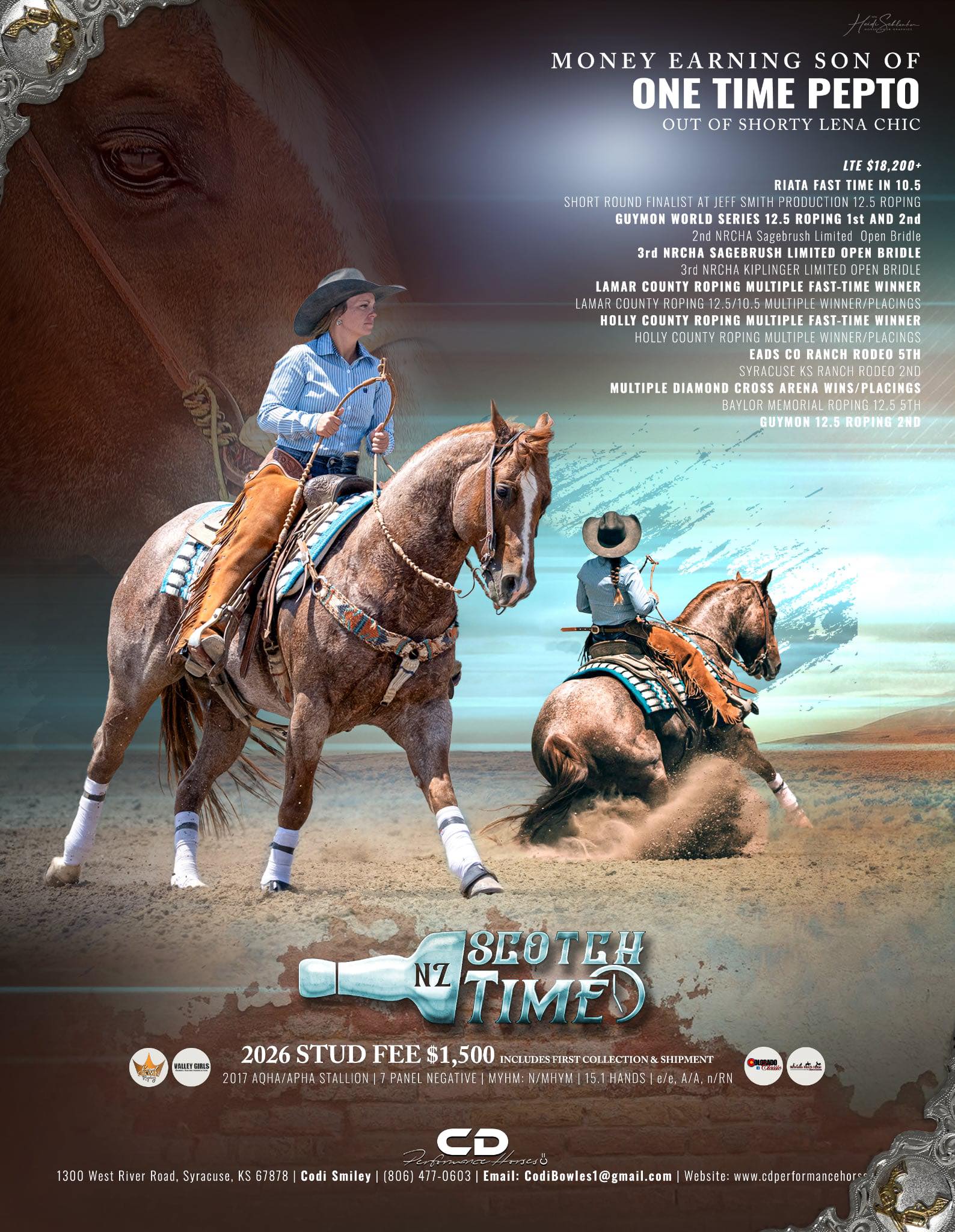NZ Scotch Time is the kind of stallion that earns respect in and out of the arena. A money earner in NRCHA, heading, heeling, and barrel racing, he’s also proven himself as a dependable, hard-working ranch horse. He’s stamping his foals with bone, size, and quiet, trainable minds. If you’re looking to add cow sense, athleticism, and versatility to your breeding program — this is the stallion that checks all the boxes. -Crosses well on all types of mares - Producing good-minded, cowy, ranch- and performance-ready foals - Already siring money earners in multiple disciplines Sire: One Time Pepto LTE $331,097 – Sire of over $1.5 Million+ • #1 Cow Horse Sire • #5 Overall Cutting Sire • Sire of champions in NCHA, NRCHA, and AQHA Dam: Shorty Lena Chic NCHA earner of $8,184 – Producer of $85,000+ Dam’s Sire: A Chic In Time LTE $300,000 2nd Dam: Shorty Lena Sue Producer of over $412,000