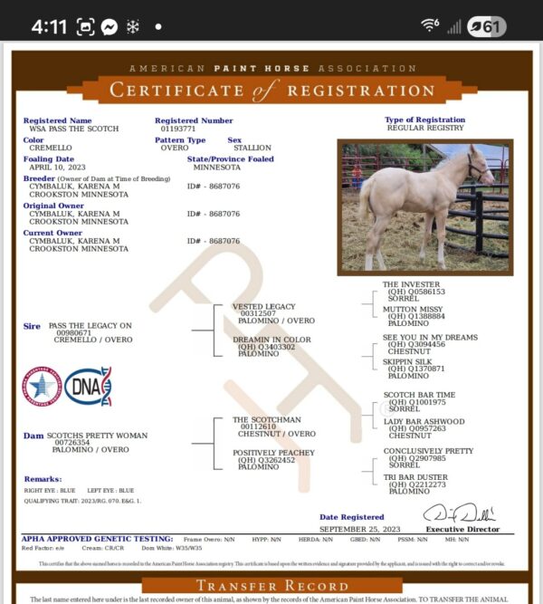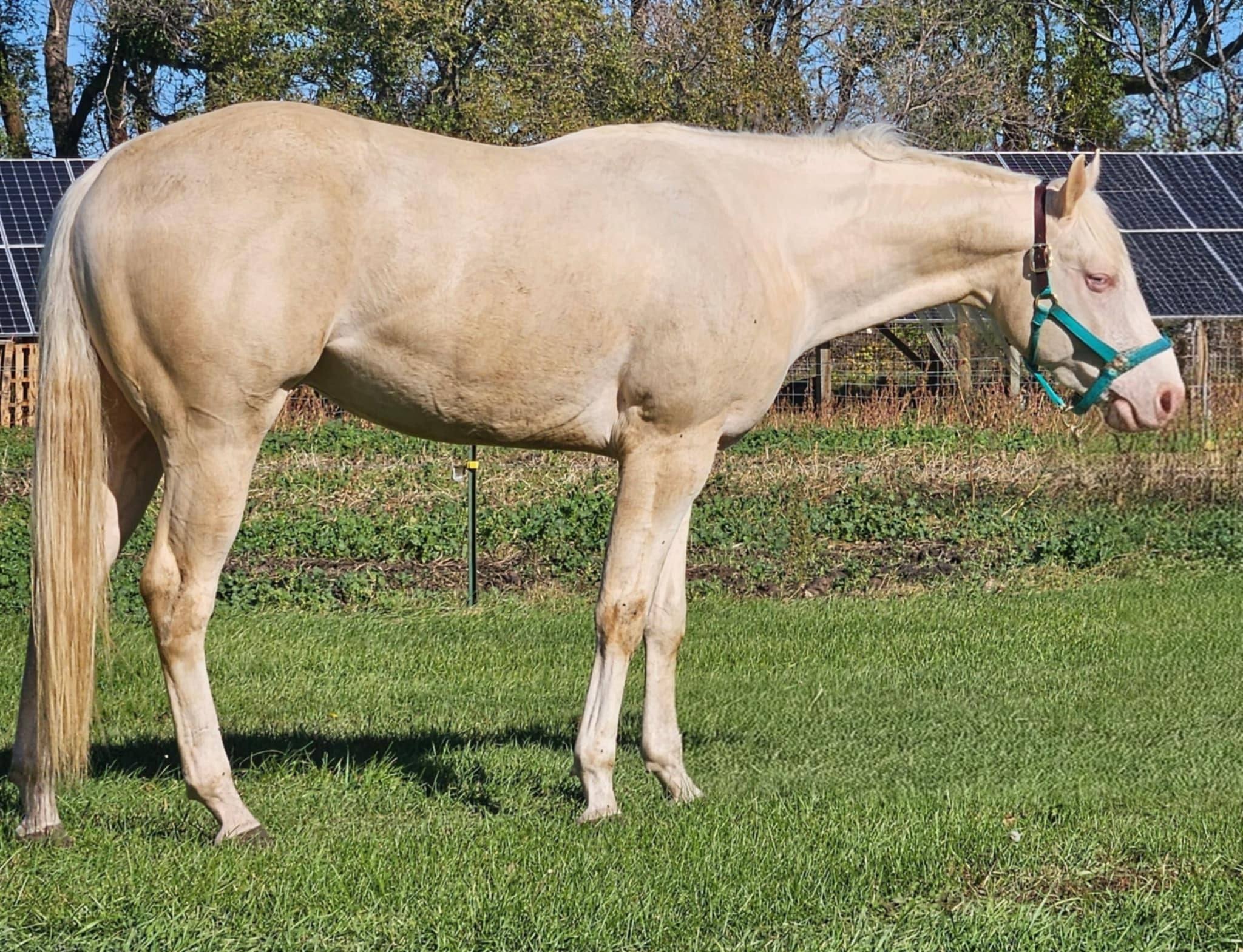 15.3 hand at 2.5 years old, Double registered cremello son of Multiple WORLD & National Champion producing sire, Pass The Legacy On out of Sheza Pretty Woman, (dam of Dirty Callahan)